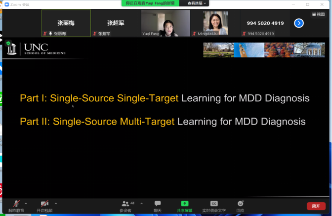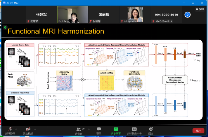 2022年3月13日(星期日)上午九点,受太阳集团智能数据分析团队邀请,北卡罗来纳大学教堂山分校房钰棋博士后在线上做了关于Unsupervised Cross-Domain Functional MRI Adaptation for Major Depressive Disorder Diagnosis 的学术报告,除智能数据分析团队的全部教师和研究生参加以外,本次会议也邀请了其他高校的老师和学生参加,在会议中师生们进行了精彩的发言讨论。