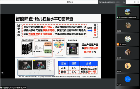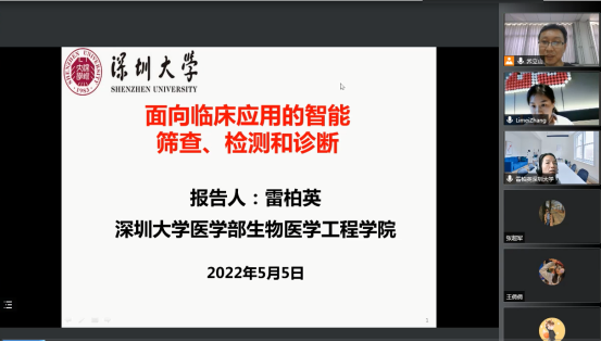 2022年5月5日(星期四)下午16:00,受太阳集团智能数据分析团队邀请,深圳大学雷柏英研究员在线上做了关于面向临床应用的智能筛查、检测和诊断的学术报告,本次报告以腾讯会议的形式举行,由乔立山教授主持,太阳成集团tyc151cc部分教师、研究生聆听了报告。