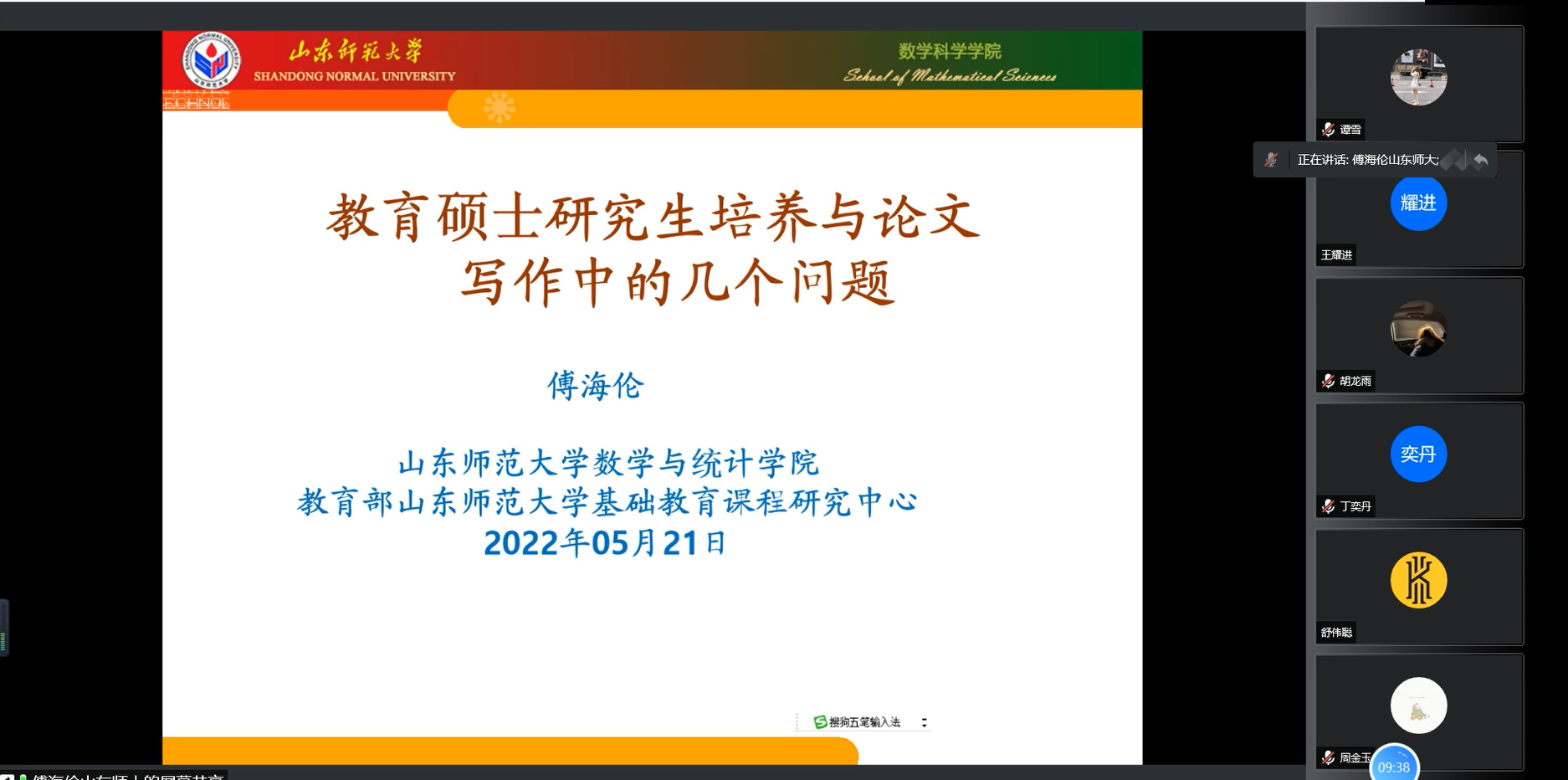 傅教授在本次报告中分析了近10年来国家教指委关于教育硕士专业学位研究生培养中的政策要求和主要变化,总结了教育硕士培养中的现状和问题,重点分析教育硕士专业学位(学科教学数学)论文选题新要求和变化,结合典型案例说明专业学位论文写作中的注意问题,包括论文结构内容安排和写作规范格式与要求等。