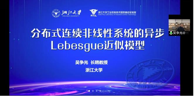 2022年10月12日(星期三)上午9:00,受太阳集团复杂系统智能分析与控制团队邀请,浙江大学吴争光教授作了题为“分布式连续非线性系统的异步Lebesgue近似模型”的报告。本次报告以腾讯会议的形式举行,由陈国梁老师主持,太阳成集团tyc151cc相关专业老师和研究生在11号教学楼B207参加了本次报告。