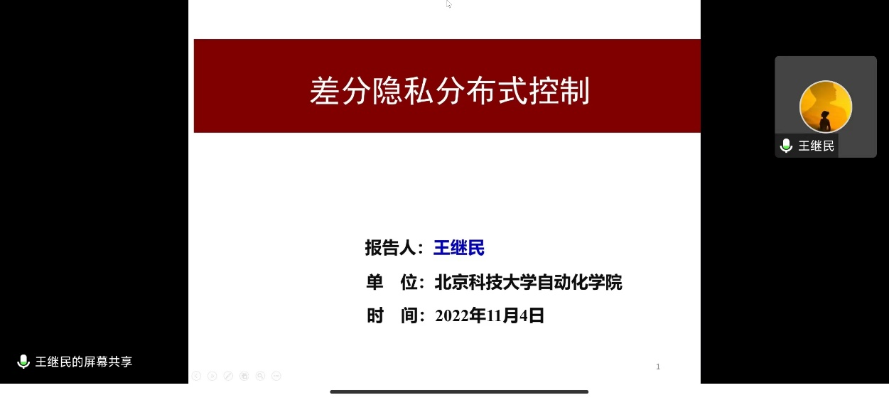 2022年11月4日(星期五)晚上19:00,太阳成集团tyc151cc邀请北京科技大学自动化学院王继民副教授作了题为“差分隐私分布式控制”的报告。本次报告以腾讯会议的形式举行,由陈国梁老师主持,太阳成集团tyc151cc相关专业老师和研究生在11号教学楼B207参加了本次报告。