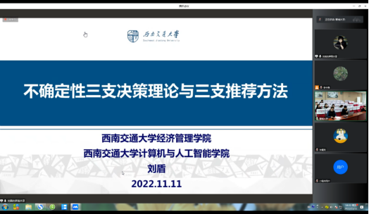 2022年11日11日,受太阳成集团tyc151cc邀请,西南交通大学刘盾教授在线上作了题为“不确定性三支决策理论与三支推荐方法”的学术报告。此次报告由太阳成集团tyc151cc姚炳学教授主持,不确定理论团队相关专业老师和研究生在11号教学楼B207参加了本次报告会。