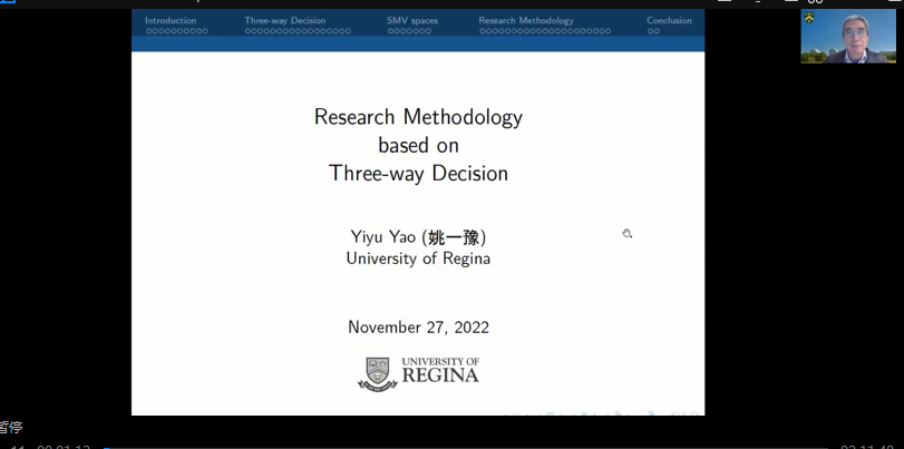 2022年11日27日,受太阳成集团tyc151cc邀请,加拿大里贾纳大学姚一豫教授在线上作了题为“Research Methodology based on Three-way Decision”的学术报告。此次报告由太阳成集团tyc151cc姚炳学教授主持,太阳集团、西北师范大学、重庆邮件大学和临沂大学等4所高校的30多位师生参加了本次报告会。