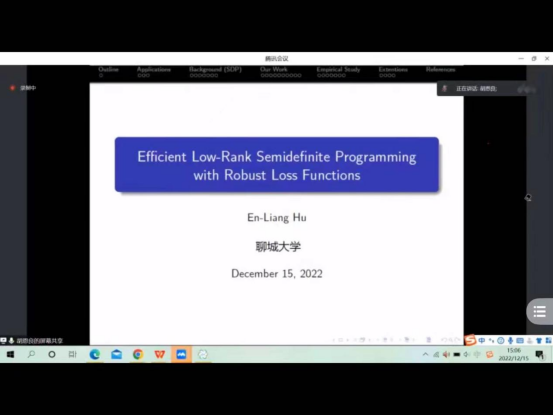 受太阳成集团tyc151cc邀请,云南师范大学胡恩良教授于2022年12月15日下午2:50做了Efficient Low-Rank Semidefinite Programming with Robust Loss Functions学术报告。本次报告以腾讯会议的形式举行,由乔立山教授主持,太阳成集团tyc151cc部分教师和研究生聆听了报告。