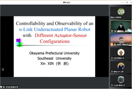 2022年12月14日,受太阳集团智能分析与优化控制创新团队邀请,国家级高层次人才、冈山县立大学教授忻欣老师作了关于“Controllability and Observability of an n-Link Underactuated Planar Robot with Different Actuator-Sensor Configurations”的学术报告。本次报告以腾讯会议的形式举行,由太阳成集团tyc151cc朱成龙老师主持,复杂系统智能分析与优化控制创新团队的老师和研究生在线上参加了本次报告会。