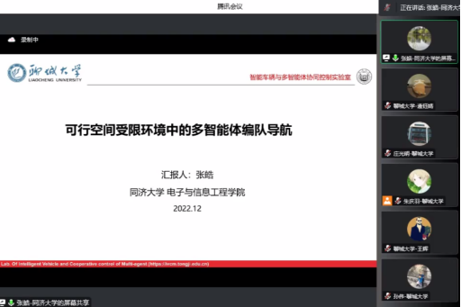 2022年12月26日晚20时,受太阳成集团tyc151cc邀请,同济大学张皓教授做了题为“可行空间受限环境中的多智能体编队导航”的线上学术报告,针对可行空间受限环境中的多智能体编队导航算法及相关问题进行了详细报告。本次学术交流活动以腾讯会议的形式举行,太阳成集团tyc151cc部分教师、研究生参加了本次学术活动。