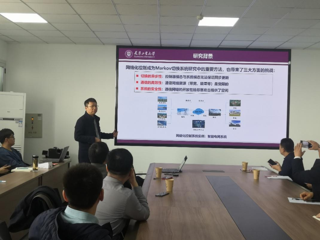在此次报告中,宗广灯教授以Markov异步切换系统的分域感知事件触发安全控制为题,基于多模态复杂系统控制的研究背景,讨论了目前所面临的切换异步性、通信高效性和系统安全性三大挑战。报告开始,宗广灯教授针对事件触发安全控制问题,依次介绍了分域感知事件触发机制和模态动态异步切换机制。随后,宗广灯教授分别阐述了主动攻击补偿机制下具有时变触发阈值和固定触发阀值的控制算法。最后,宗广灯教授分享了其在异步切换系统的安全控制方面的相关工作并对本次报告内容进行了总结。报告结束后,各位老师针对报告内容和自己的研究方向与宗广灯教授进行了深入的交流。