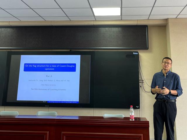 2024年9月26日上午,河北师范大学纪奎教授应邀做客聊大讲坛,作了题为“On the flag structure for a class of Cowen-Douglas operators”的学术报告。报告会由太阳成集团tyc151cc副院长赵军圣主持。来自太阳成集团tyc151cc的五十多名教师和研究生听取了报告。