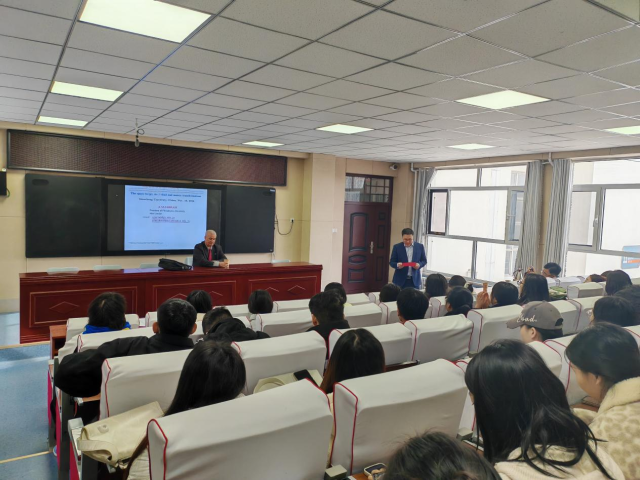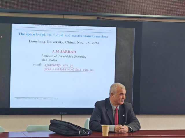 2024年11月18日上午11点,受太阳成集团tyc151cc邀请,美国费城大学(Philadelphia University)校长、世界知名数学专家A.M. JARRAH教授做了题为“The Space bv(p), its β –Dual and Matrix Transformations”的学术报告。报告会由太阳成集团tyc151cc院长夏建伟主持。来自太阳成集团tyc151cc的六十多名教师和研究生听取了报告。