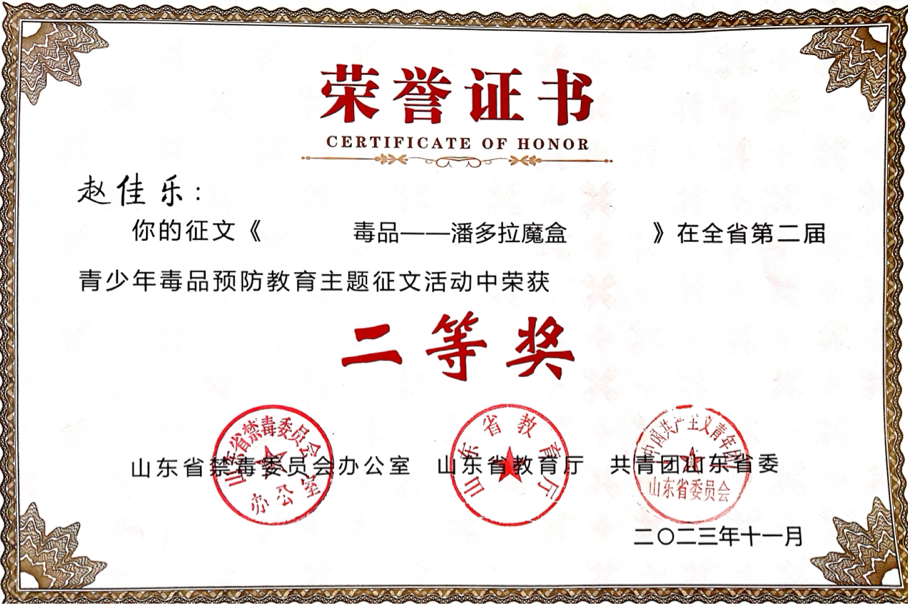 近日,山东省第二届青少年毒品预防教育主题征文比赛落下帷幕,我院数据科学与大数据技术专业2022级2班赵佳乐同学荣获二等奖。