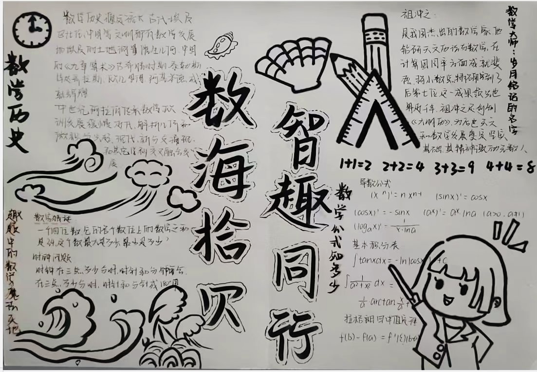 本次活动通过线上平台开展,同学们积极参与,围绕“数学知识分享”这一主题,充分发挥自己的想象力,将各种艺术元素同数学知识、趣味数学小故事巧妙融合,从勾股定理到黄金分割,从阿基米德测皇冠到高斯巧算数列,这些知识和故事在同学们精心地创作下,化为一幅幅生动有趣的作品,无论是色彩斑斓的绘画,还是设计精巧的图文,都兼具观赏性与知识性,令人眼前一亮。充满奇思妙想的数科学子,通过手抄报的形式,让相对枯燥的知识变得生动有趣,展示他们心中数学与艺术的美好融合。活动结束后,评委对参赛作品进行打分评选,选出优秀参赛作品以示表扬和鼓励。