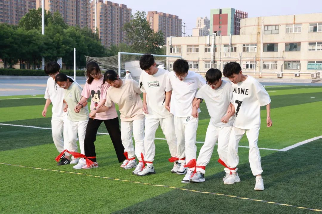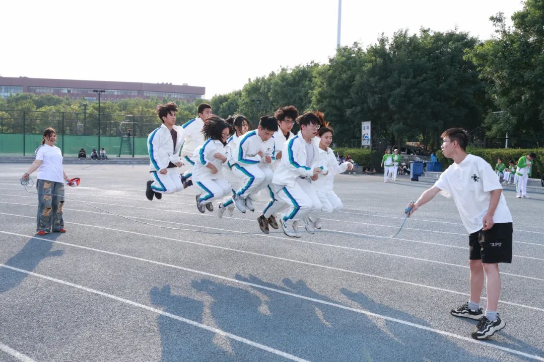 本次趣味运动会分为绳影穿梭、兔子跑步、8人9足竞速赛、旱地龙舟接力赛、盲行寻锣、“绳”采飞扬六个项目。在绳影穿梭”赛道上,10名队员分两组持绳接力同学们在绳影间灵活穿梭,展现出矫健的身姿和敏捷的反应能力;兔子跑步项目里,6名队员套着麻袋如弹簧般跃向30米终点,蹦蹦跳跳,让现场充满欢声笑语;在“8人9足竞速赛”中,赛前队员们认真检查绳索,比赛时相互扶持,摔倒后迅速站起继续前进,展现了团结的力量;在“旱地龙舟接力赛”中,队员们握住龙舟把手,目光坚定,默契协作,龙舟飞驰而出,向着终点全力冲刺,汗水在阳光下折射出协作的光芒;“盲行寻锣”项目上演现实版“听声辨位”,蒙眼队员迈出脚步,每一步都小心翼翼,队友们在一旁大声呼喊,为他指明方向,成功敲击铜锣的那一刻,喜悦瞬间在队伍中蔓延;在“绳”采飞扬的场地上,20次连贯跳跃的目标让队员们全神贯注,彩绳翻飞间,8人同步起落,即使出现失误,也不放弃,在加油声中快速调整。
