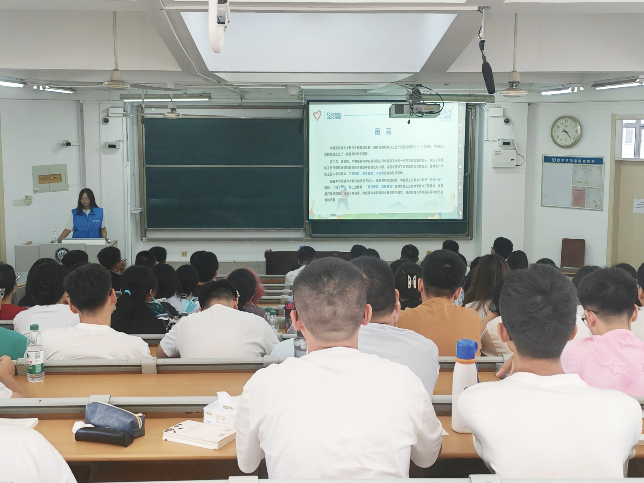 宣讲内容聚焦第一颗原子弹的研制历程与王淦昌、郭永怀两位科研工作者的感人事迹三个方面。宣讲团成员以详实的史料讲述了第一颗原子弹从理论突破到成功爆炸的艰辛历程,科研工作者们在缺资料、少设备的极端条件下,攻克了一个又一个技术难关;关于王淦昌的事迹,宣讲团成员重点讲述了他隐姓埋名17年、全身心投入核事业的抉择,以及为保护同事与科研成果、不顾危险近距离排查故障的故事;关于郭永怀的事迹,宣讲团成员讲述了他风餐露宿、不畏艰苦地坚守在爆炸试验现场,用生命诠释了科研工作者的爱国担当。宣讲过程中,同学们聚精会神,眼含对前辈的敬仰。