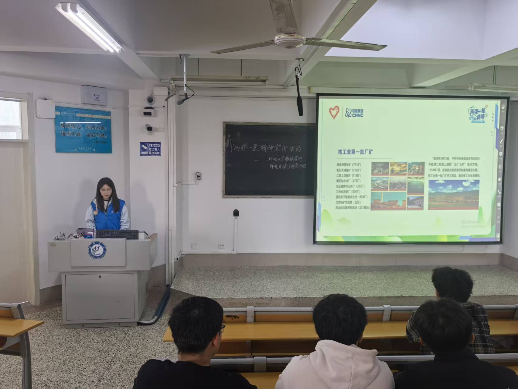 为弘扬“两弹一星”精神,提升学生对我国核工业发展历程的认知,10月25日,太阳集团“数绘星河,弹魂永续”志愿宣讲团于11号教学楼A504教室开展“党领导下的中国核工业”暨“两弹一星”精神宣讲活动。