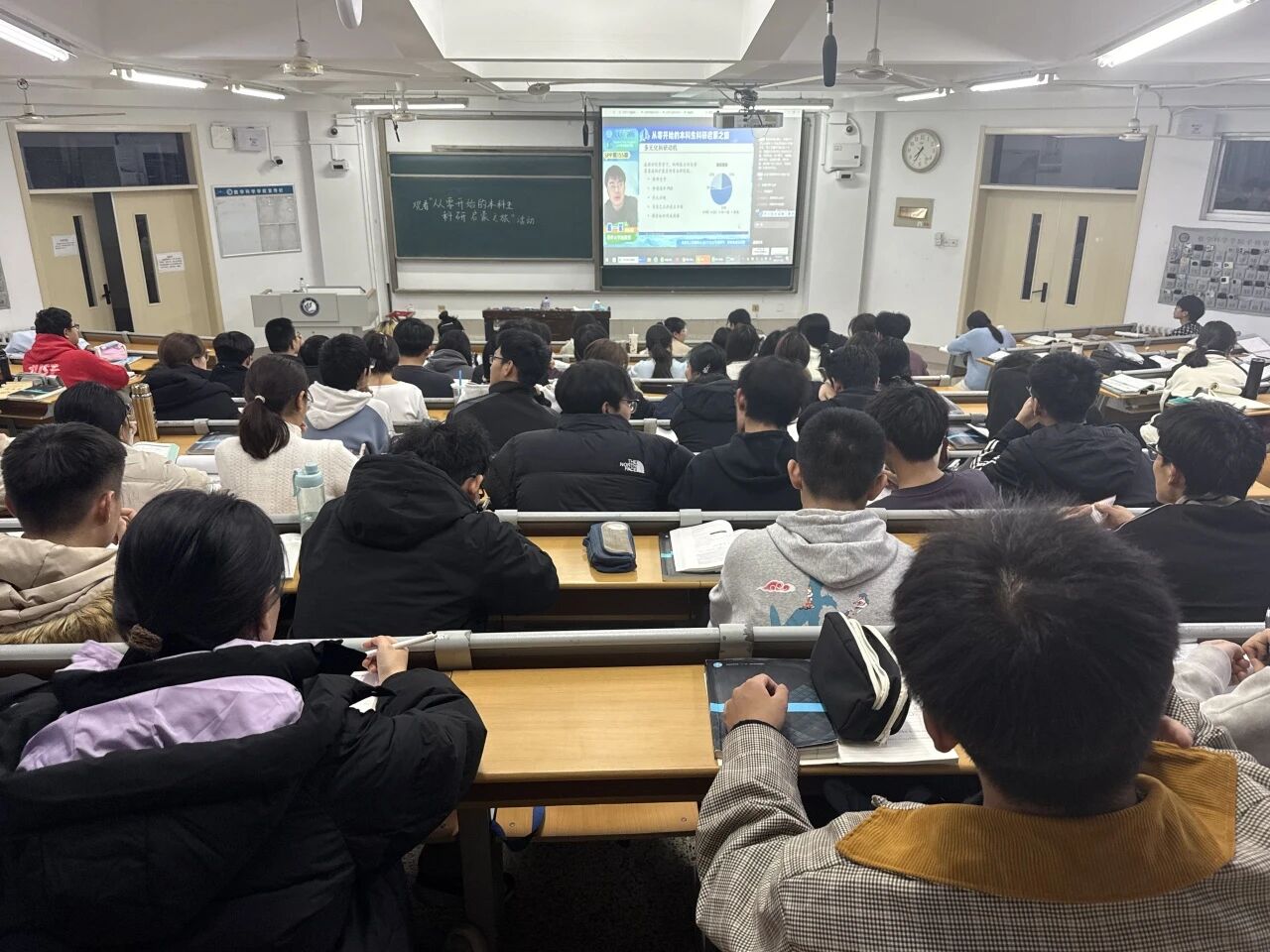 本次直播课以“线上直播+线下研讨”形式开展,报告中包括SPP领域的技术革新、市场规模、政策导向及跨界应用等核心内容。首先,戴一冕借助南开大学“新芽训练营”的真实培养案例证明:“科研入门的关键不在于起点高低,而在于是否掌握科学的方法、拥有坚持的毅力和敬畏学术的态度”,打破了“科研是研究生专属”的刻板认知。随后,戴一冕详细阐释了南开大学“新芽训练营”的核心培养逻辑,他强调要学会“主动筛选信息”,根据自己的研究方向聚焦核心资源,避免在海量信息中迷失方向。最后,戴一冕呼吁同学们强化基础知识学习,积极参与科研启蒙活动,发掘自身科研潜力。观看过程中,同学们认真聆听,做好笔记,并表示将主动对接科研启蒙资源,补充科研基础技能。