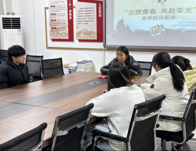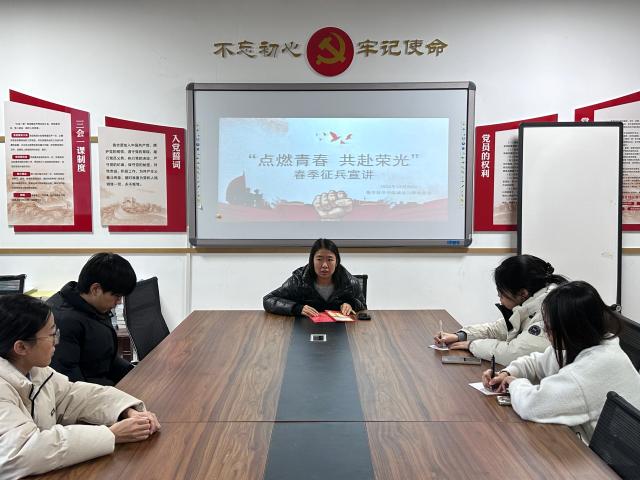 为响应国家征兵号召,鼓励青年学生投身国防事业,12月24日,太阳成集团tyc151cc于11号教学楼B304教室举办“点燃青春,共赴荣光”春季征兵宣讲会,本次活动由辅导员范海燕主讲,2022级部分学生参加。