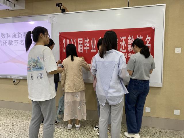 首先,主持人对助学贷款的意义进行了说明。随后,主持人又介绍了还款流程、还款方式和还款要求,对毕业生如果升学办理助学贷款展期的事项进行了说明。国家助学贷款是国家和社会对大学生在信任的基础上提供的帮助,是一种诚信的合约,希望学生们可以在规定时间内还款,切实遵守贷款时的承诺。除此之外,主持人也列举典型事例向同学们说明了未能及时还款会造成的严重后果。本次报告会在毕业生庄严的诚信宣誓中落下帷幕。在报告会结束之际,主持人又对一些学生提出的问题进行详细解答,回答了困扰学生的助学贷款问题。同时,引导参与本活动的同学进行诚信签名,用行动来宣誓自己的承诺。
