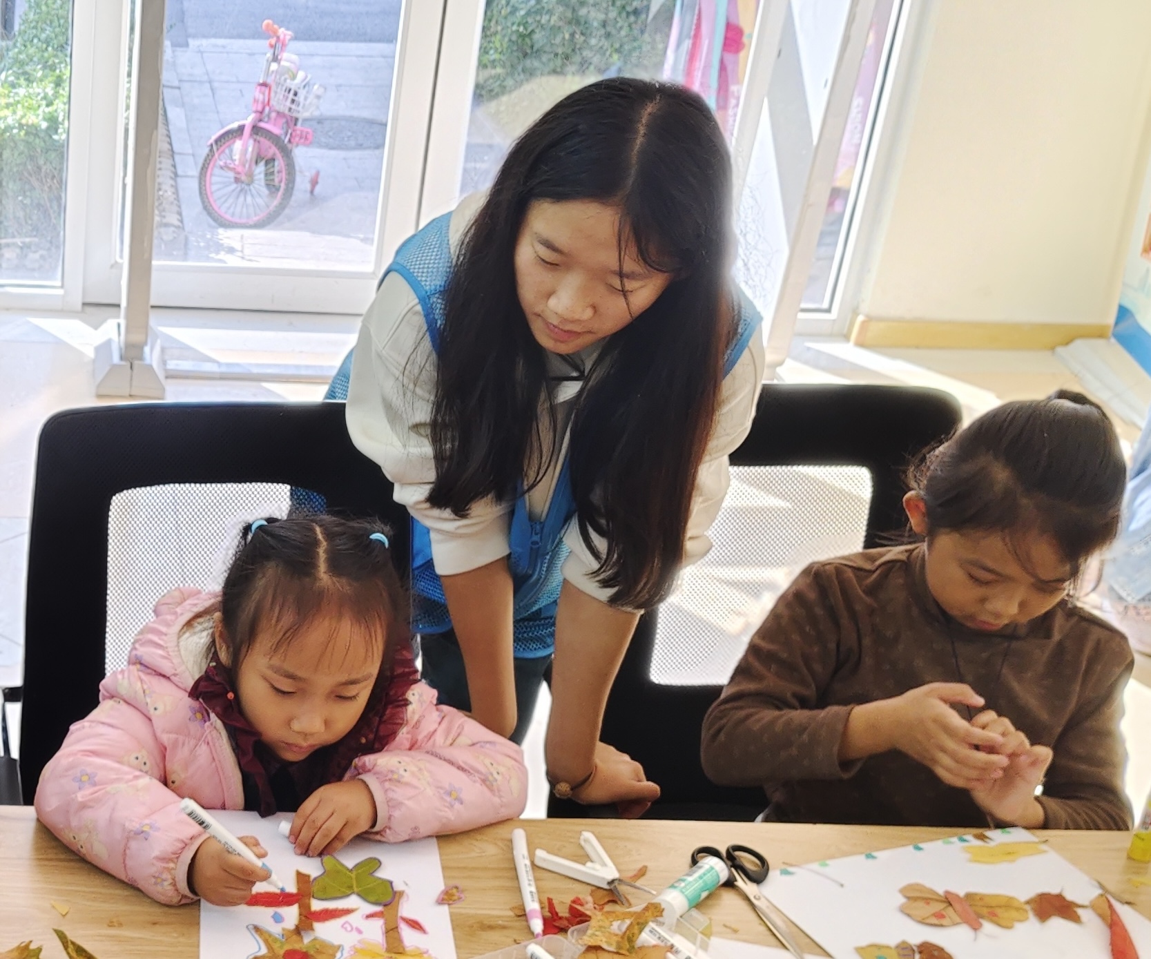 本次活动主要包括讲解秋韵含义、欣赏树叶以及落叶创作三方面。活动伊始,志愿者通过PPT生动讲解了观察树叶形状、颜色和纹理的方法,分享了巧妙组合树叶等自然元素以呈现秋韵的技巧,小朋友们全神贯注地聆听,眼中流露出对美丽树叶的喜爱和对秋韵的向往。随后,志愿者引领小朋友走进户外,挑选出自己最喜欢的树叶进行采集,让孩子们与大自然亲密接触,感受秋天的气息。活动最后,志愿者和小朋友一起回到室内进行落叶创作,他们耐心地向小朋友演示落叶作品的制作步骤,悉心指导,孩子们通过自己的双手,将一片片色彩斑斓的树叶拼凑成心中最美的画面,每一个作品都承载着他们对秋天独特的理解和对生活的热爱。