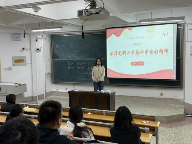 活动伊始,团支部书记结合丰富翔实的图文资料解读了党的二十届四中全会公报的核心要义与精神内涵,她们讲解条理清晰,帮同学们梳理清楚了理论学习的框架和知识点,让同学们能快速把握全会的核心要义与精神实质。随后,学生们集中观看了有关中国共产党第二十届中央委员会第四次全体会议精神的专题解读视频,以增强理论学习的直观性,该视频通过权威专家的深入分析和生动阐释,将国家宏观政策布局与青年群体的成长发展需求紧密关联,以形象具体的方式呈现全会精神的现实意义与实践要求,进一步提高了同学们的理解与认同,有效激发同学们的学习积极性。讨论环节,同学们围绕“青年担当与‘十五五’征程”这一核心议题,结合专业背景和自身的学习生活实际踊跃发言,现场气氛热烈。