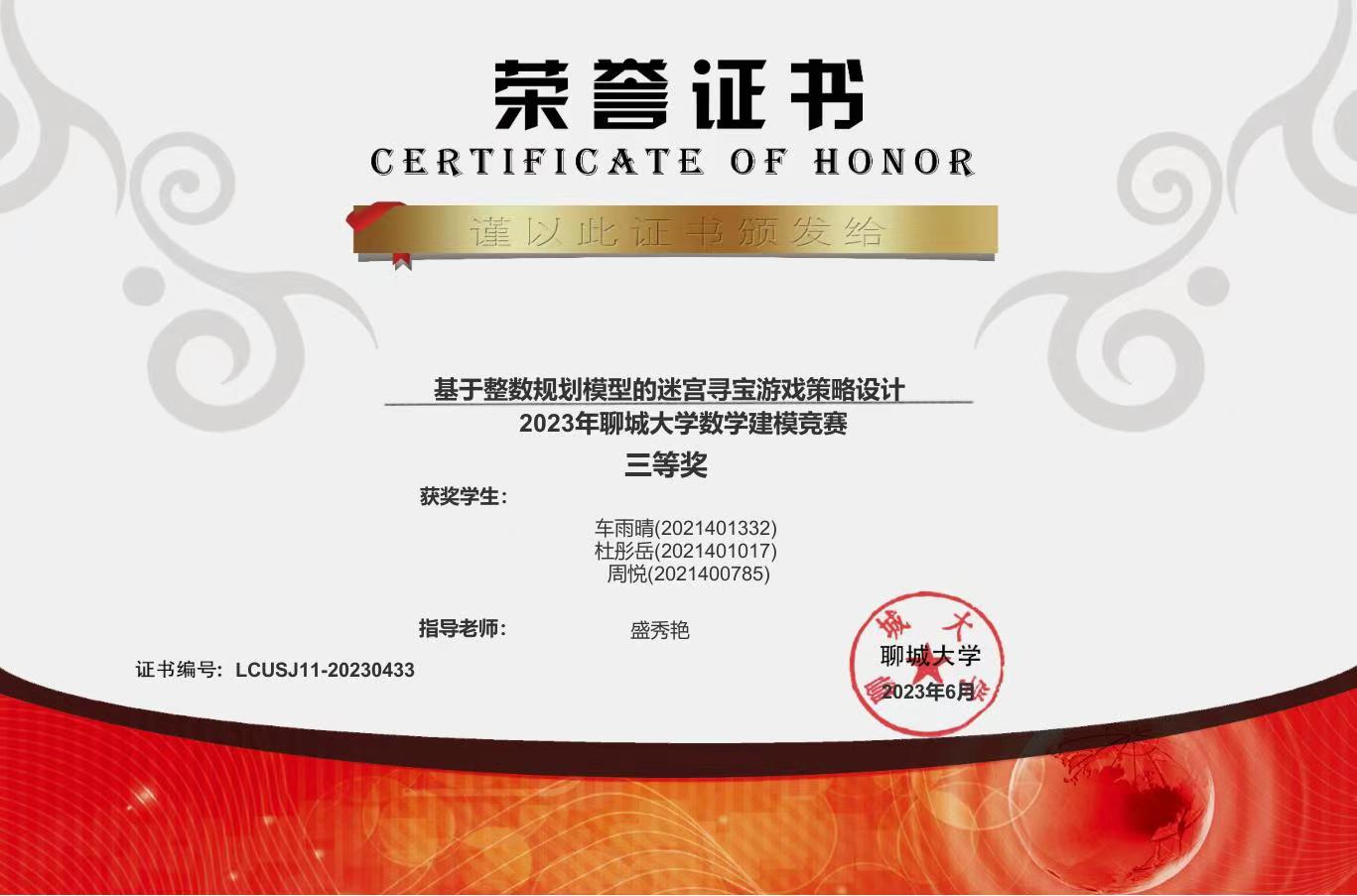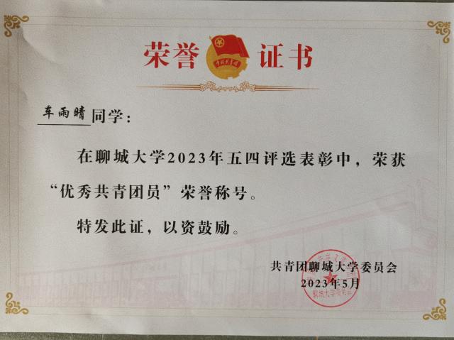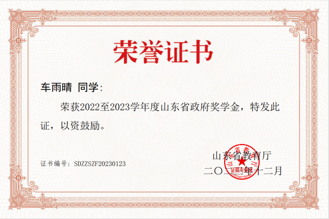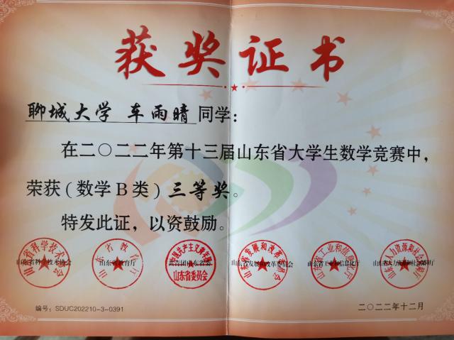 卓越之路,源自不懈努力。车雨晴有明确的目标,脚踏实地,勤学苦练,自入学以来,成绩稳居班级前三,先后获得山东省政府奖学金、太阳集团英才奖学金、二等奖学金等。她积极参加学科竞赛,并荣获第十三届山东省大学生数学竞赛(数学B类)三等奖、2023年全国大学生数学建模竞赛山东赛区二等奖、第十五届大学生数学竞赛本科组数学B类三等奖等3项奖项。