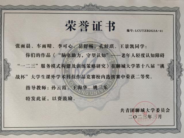 坚持创新发展,不断挑战自我。车雨晴积极投身于各类科创赛事中,参与“挑战杯”、“互联网+”等科创赛事,并荣获太阳集团第十八届“挑战杯”大学生课外学术科技作品竞赛校内选拔赛二等奖、2023年“互联网+”大学生创新创业组大赛太阳集团校赛红旅赛道本科生公益组金奖等2项奖项。