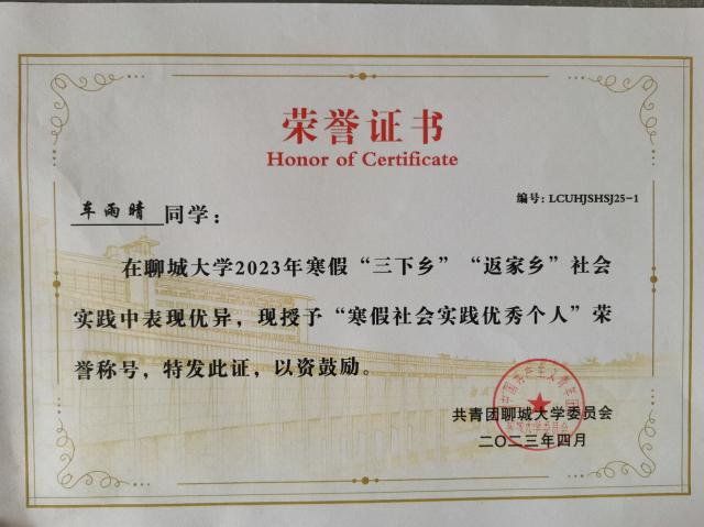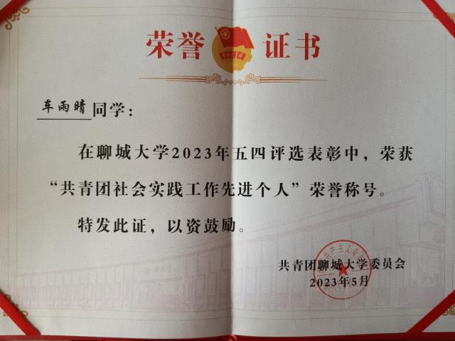 理论需要同实践相结合。车雨晴积极投身于社会实践之中,曾2次作为社会实践负责人带领团队开展社会调研,带领团队成员所撰写的调研报告荣获太阳集团2022年暑期“三下乡”社会实践调研报告校级三等奖等奖项,并荣获2022年和2023年山东省“三下乡”社会实践优秀学生荣誉称号,于2023年暑假奔赴井冈山探究井冈山的时代价值及传承现状,以青年力量助力传承井冈山精神。此外,在日常生活中她也积极参与志愿服务活动,志愿服务时长达101小时。