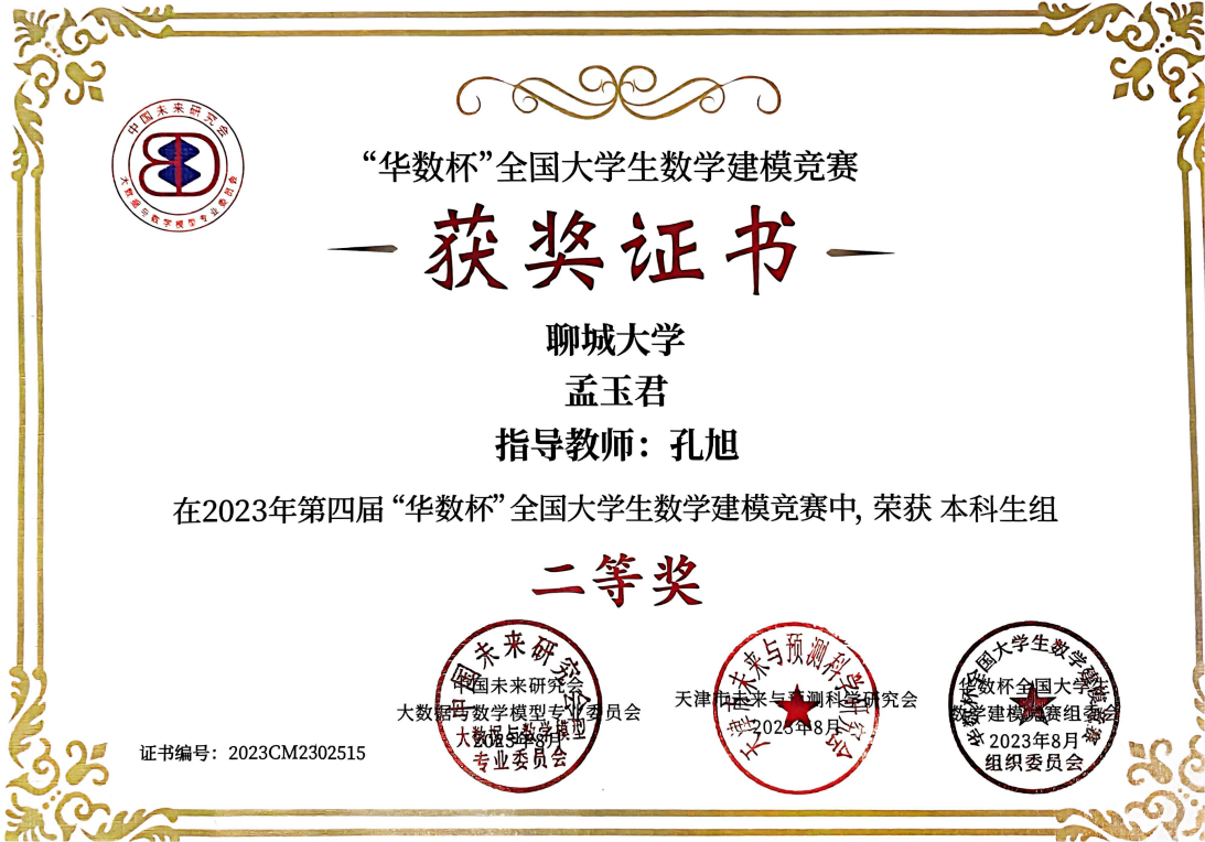 2023.08 全国大学生华数杯数学建模竞赛二等奖