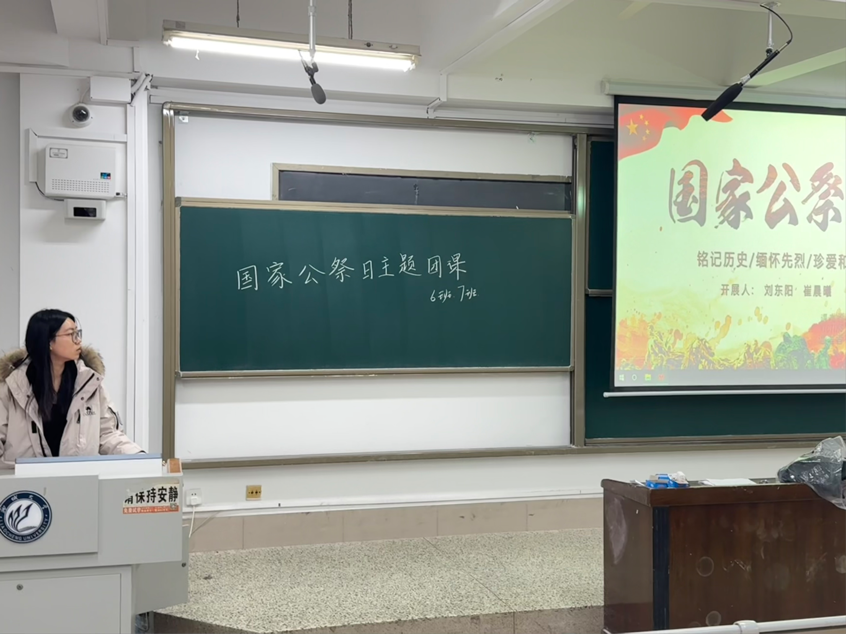 太阳成集团tyc151cc2024级7班于11号教学楼A207开展“勿忘国耻,振兴中华”国家公祭日主题团日活动。团支书崔晨曦讲解公祭日释义,将沉重的历史一步步描述出来,利用图片呈现出当时的场景,让学生清楚理解国家设定国家公祭日的意义,使其铭记历史、缅怀先烈。她强调,同学们要积极践行社会主义核心价值观,培养国家意识,建立民族信仰。此次团课活动,让同学们从中受到教育、得到启迪,提醒每一位学生铭记历史,肩负起振兴中华民族的重任,奋发图强,努力学习,报效祖国。