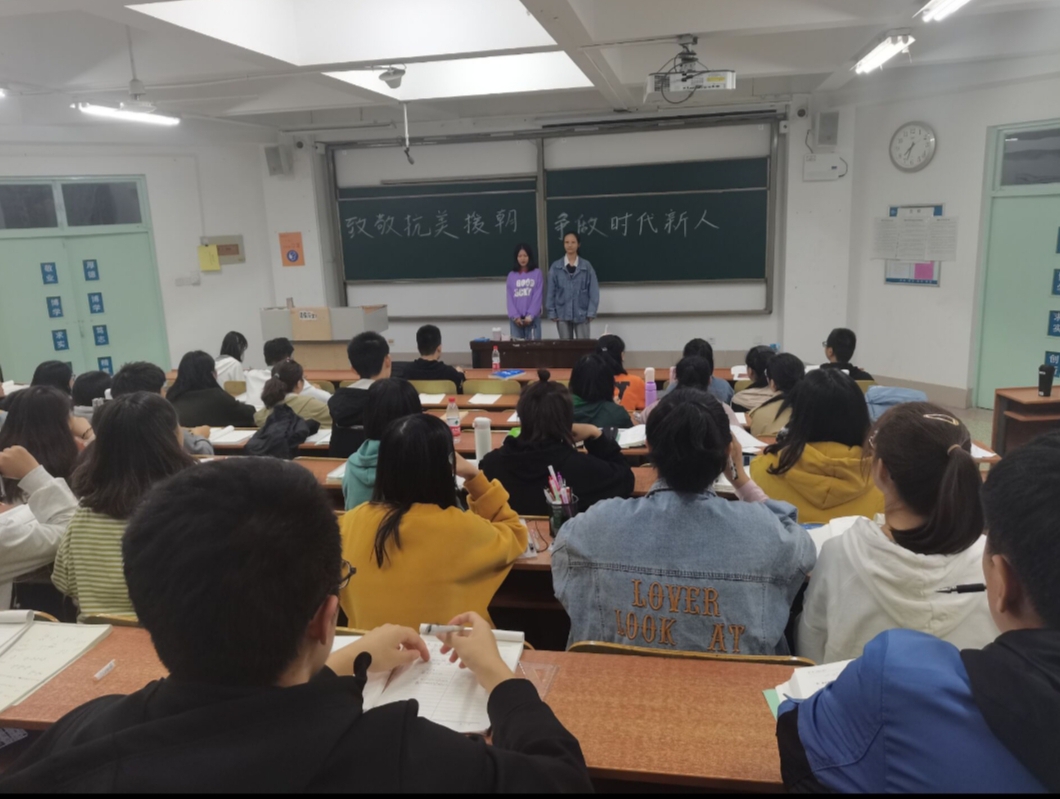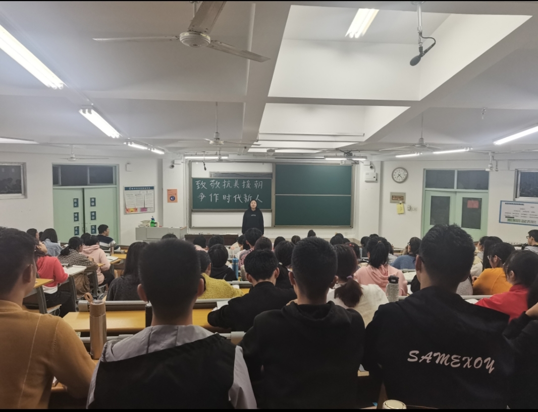 “致敬抗美援朝 争做时代新人”主题团日活动开始,各班团支书分别就此活动为同学们进行讲解,其中,二班团支书就抗美援朝战争的前因后果为同学们展开叙述,同学们个个专心致志、津津有味地听讲。三班团支书举出了邱少云、黄继光、杨根思等人在抗美援朝中做出的贡献,使同学们对抗美援朝中的志愿军们有了更加深刻的了解。同学们心潮澎湃,教室里响起了同学们对历史英雄由衷敬佩的掌声。最后五班六班团支书共同为大家普及了抗美援朝战争胜利后的积极意义,极大地鼓舞了同学们为社会贡献出一份力量的决心。