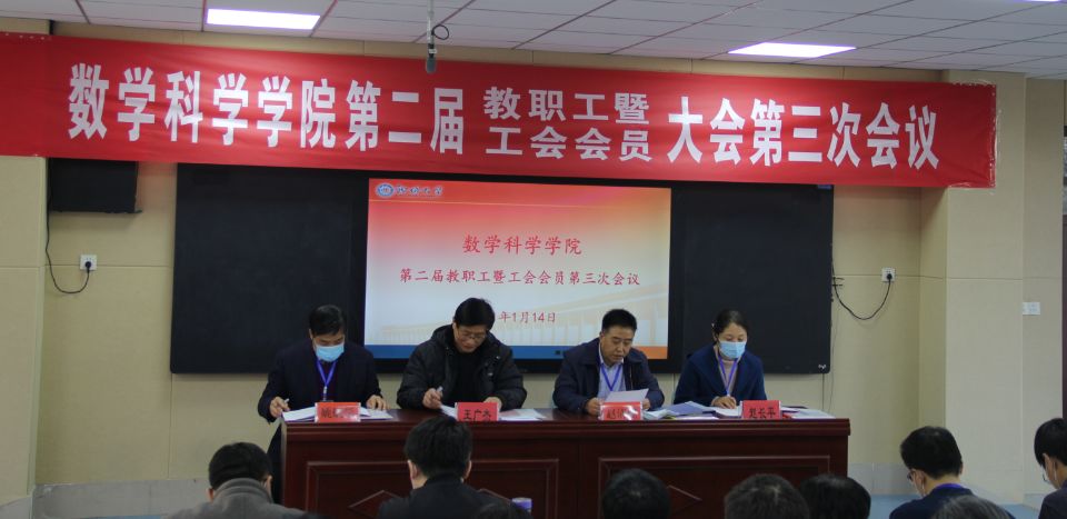 1月14日下午,太阳成集团tyc151cc在西校区11号教学A201举行第二届全体教职工暨工会会员大会第三次代表大会,校工会副主席王广杰、学院党总支书记赵清理、院长姚炳学、党总支副书记副院长孙世全、副院长范丽亚、夏建伟,分工会主席办公室主任赵长平及全体教职工参加会议。