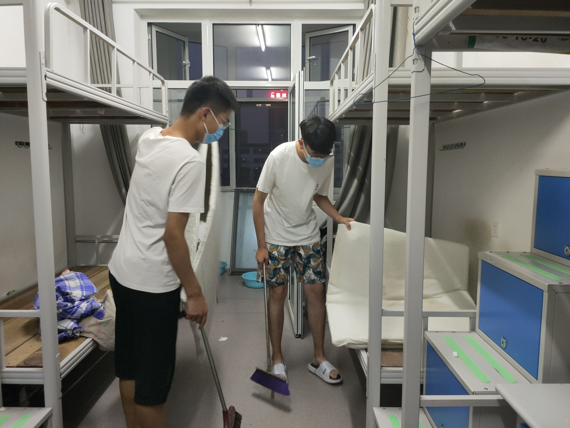 参与活动的学生带着清洁工具来到宿舍楼,进到每间毕业生宿舍,擦拭桌面,清洁地面,清除宿舍垃圾。将阳台上的衣物收到屋内,将散落在床上、悬挂在床头的衣服认真收起来,将毛巾等纺织品逐一收起,将鞋子整齐地摆放到床下,以免喷洒消毒液时损伤衣物、鞋子等物品。清扫工作结束后,关闭门窗,消除安全隐患,将垃圾拎下楼。尽管天气炎热,但同学们化身收纳能手,将宿舍物品归置到合适位置,大家团结协作,发扬不怕脏不怕累的精神,服从调遣,合理分工,经过2个多小时的劳动,毕业生宿舍整洁有序,焕然一新。