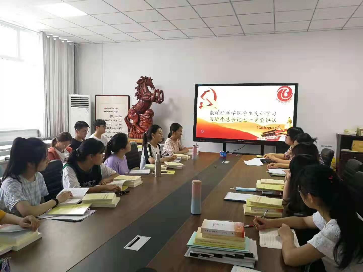 7月7日下午,学院学生党支部书记张晓冬、支部委员范海燕、孙云霞与支部全体学生党员,在11#B301召开学习习近平总书记“七一”重要讲话座谈会。