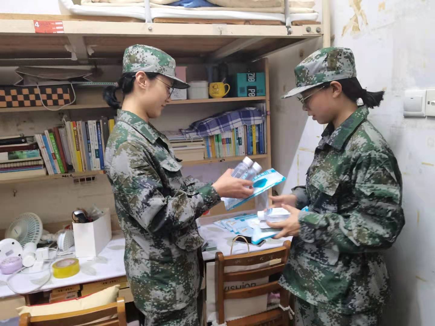 参加本次军训教导营的成员由2019级、2020级在校生组成,数科院的9名教官成员分别为宋晓雨、杜秀源、赵雪鹤、张亚楠、郑心草、任亦菲、邓梦晗、王萬嘉。受疫情影响,教官返校分别从西校北门、东校东门登记后进校,严格遵守防疫要求及返校管理规定。为此,学院专门购买医用口罩、消毒液等防疫用品,发放给军训教导营成员。