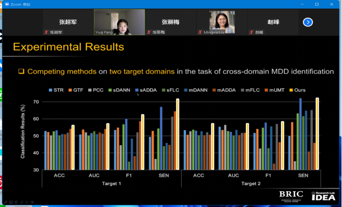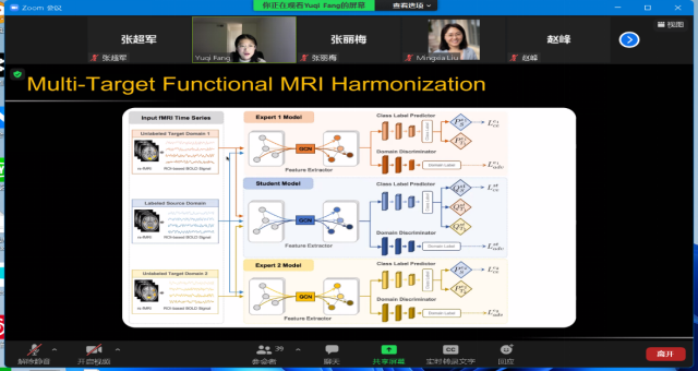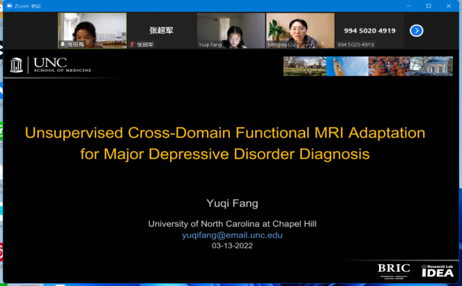 2022年3月13日(星期日)上午九点,受太阳集团智能数据分析团队邀请,北卡罗来纳大学教堂山分校房钰棋博士后在线上做了关于Unsupervised Cross-Domain Functional MRI Adaptation for Major Depressive Disorder Diagnosis 的学术报告,除智能数据分析团队的全部教师和研究生参加以外,本次会议也邀请了其他高校的老师和学生参加,在会议中师生们进行了精彩的发言讨论。