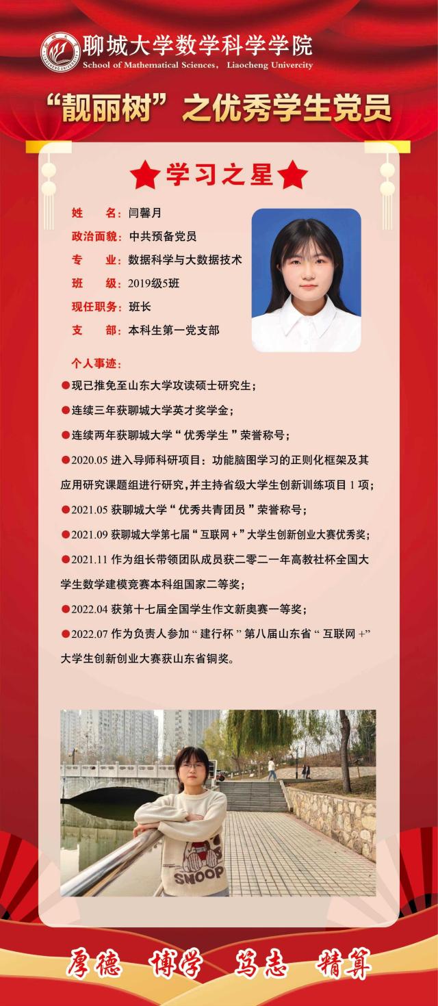 “靓丽树” | 亮出党员身份 争做先进标杆——学习之星 发布时间: 2022-11-11 为进一步发挥党员先锋模范作用,强化党员意识,铭记党员身份,履行党员义务。太阳成集团tyc151cc开展了以“亮党员身份、立先进标杆、树先锋形象”为主要内容的“靓丽树”活动,激励全体党员在新的奋进之路上,勇于担当、锐意进取、干事创业、攻坚克难,以接力跑的姿态带领全院师生紧握时代赋予的“接力棒”,锚定前进方向,笃定前行速度,铆足实干动力,在新赛道上奋力奔跑出数学“加速度”。