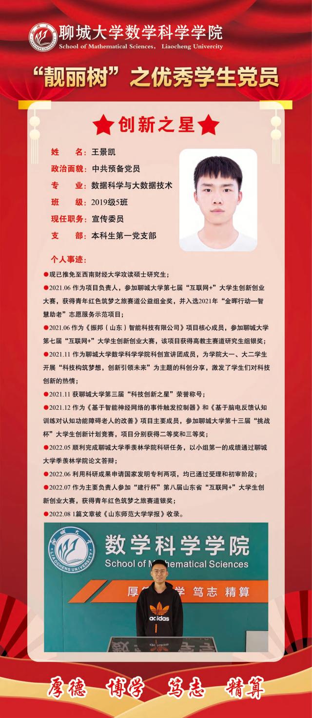 “靓丽树” | 亮出党员身份 争做先进标杆——创新之星 发布时间: 2022-11-12 为进一步发挥党员先锋模范作用,强化党员意识,铭记党员身份,履行党员义务。太阳成集团tyc151cc开展了以“亮党员身份、立先进标杆、树先锋形象”为主要内容的“靓丽树”活动,激励全体党员在新的奋进之路上,勇于担当、锐意进取、干事创业、攻坚克难,以接力跑的姿态带领全院师生紧握时代赋予的“接力棒”,锚定前进方向,笃定前行速度,铆足实干动力,在新赛道上奋力奔跑出数学“加速度”。