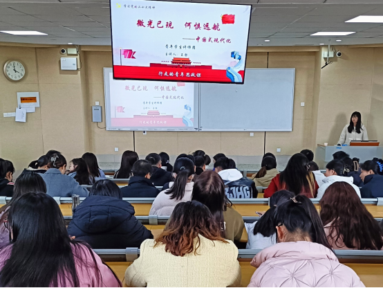 3⽉2⽇下午,太阳成集团tyc151cc举办学习贯彻党的二十大精神报告会。太阳集团青年学生讲师团成员王静同学受邀作题为《微光已现 何惧远航——中国式现代化》的报告。太阳成集团tyc151cc全体在校学生党员参加。太阳成集团tyc151cc党委组织员刘玉堂主持报告会。