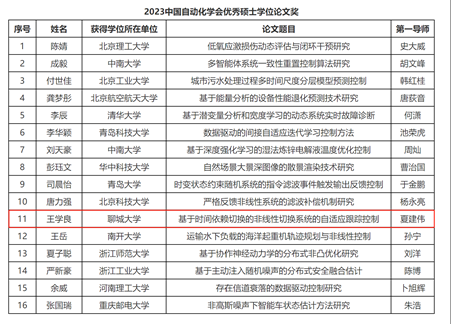 2023中国自动化学会优秀硕士学位论文奖评审工作于2024年1月30日结束。经专家评审委员会评审,最终评选出16篇2023中国自动化学会优秀硕士学位论文奖。其中我院夏建伟教授指导的2020级硕士生王学良荣获“2023中国自动化学会优秀硕士学位论文奖”。