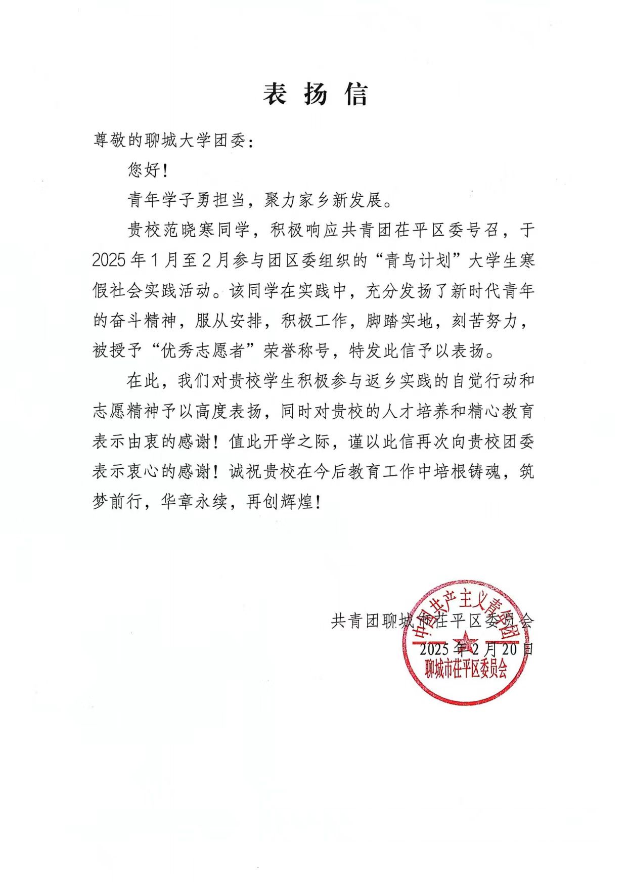 2月20日,我院收到一封来自茌平区团委的表扬信,信中对2024级数学与应用数学专业2班的范晓寒同学给予了表扬和肯定。信中提到,范晓寒同学在实践中充分发挥了新时代青年的奋斗精神,服从安排,积极工作,脚踏实地,刻苦努力,被授予“优秀志愿者”荣誉称号。