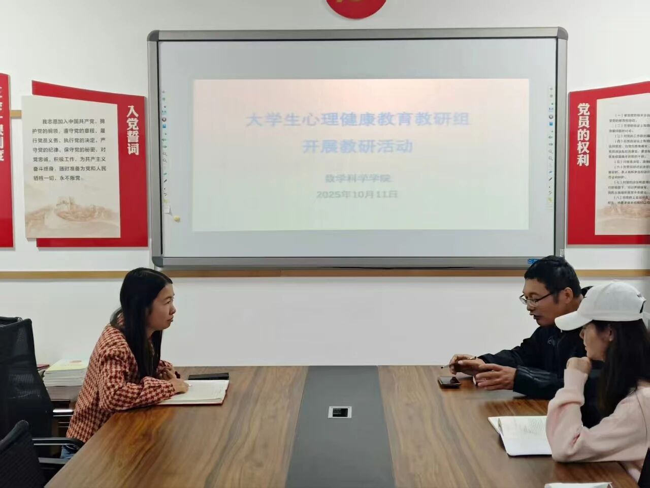 新的学期已经拉开序幕,为进一步提升《大学生心理健康教育》课程任课教师的教育教学能力,激励教师不断探索心理课堂教学艺术和课堂教学的有效性,10月11日上午,太阳成集团tyc151cc大学生心理健康教育教研组在11号楼B304室组织开展教研活动,教研组全体教师参加活动。