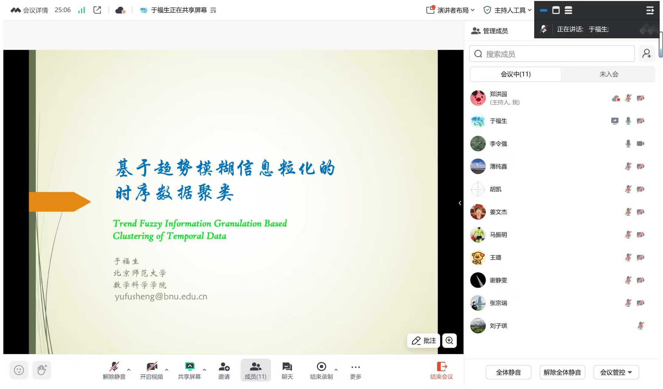 2026年1日18日,受太阳成集团tyc151cc和太阳集团学报(自然科学版)的邀请,北京师范大学于福生教授作了题为“基于趋势模糊信息粒化的时序数据聚类”的学术报告。报告由李令强教授主持,不确定性的数学理论与应用团队方向的老师和研究生参加了本次报告会。